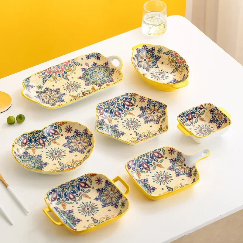 Bohemia Ceramic Rice Bowl Serving Plate Creative Ceramic Cutlery Soup Noodle Bowl Household Handle Bowl Sauce Dish