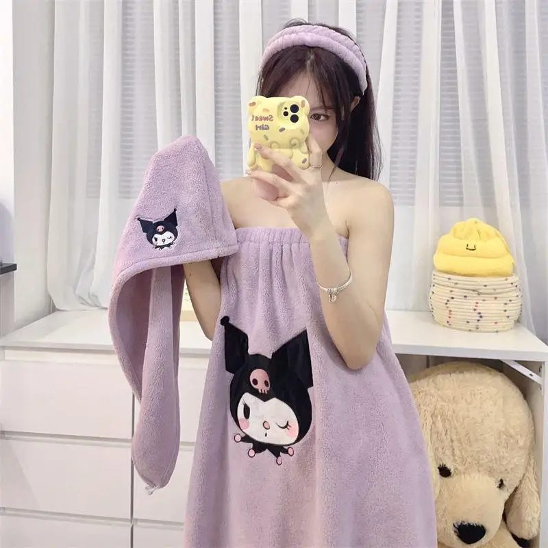 Sanrio Kuromi Cartoon Bath Towel 3Pcs Coral Velvet Hair Twist Soft Wash One 's Face Hair Band Kawaii Bath Skirt Household Items