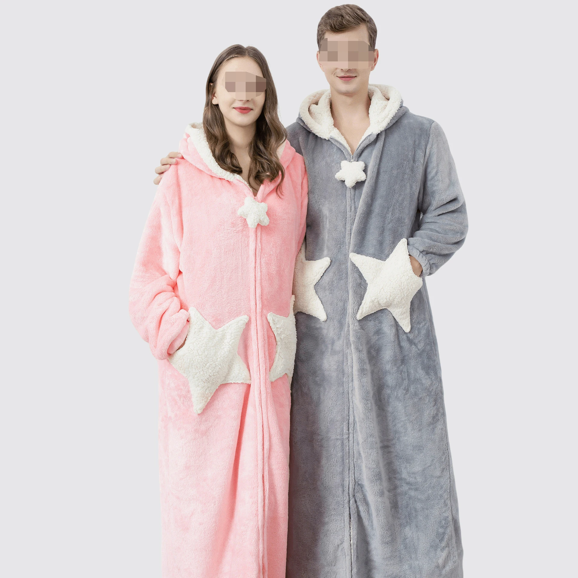 Hooded Zipper Kimono Bathrobe Gown Winter Warm Coral Fleece Sleepwear Women Loose Peignoirs Couple Cute Star Nightgown Robes