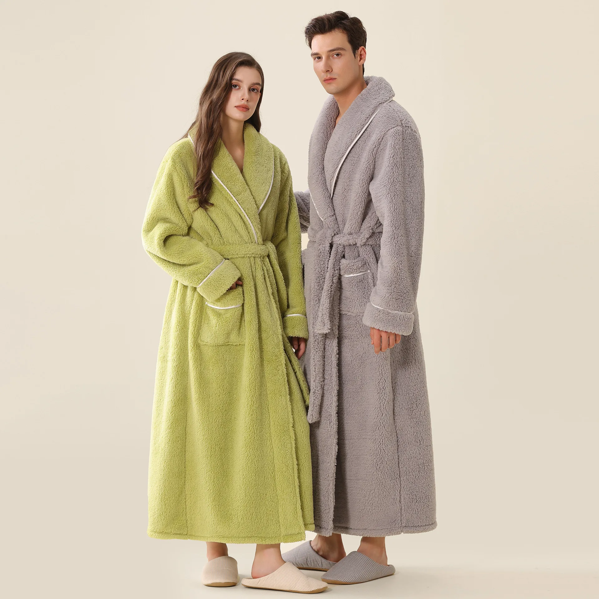 Long sleeved couple bathrobe for men and women, solid color with pockets, home sleepwear, one-piece lace up set
