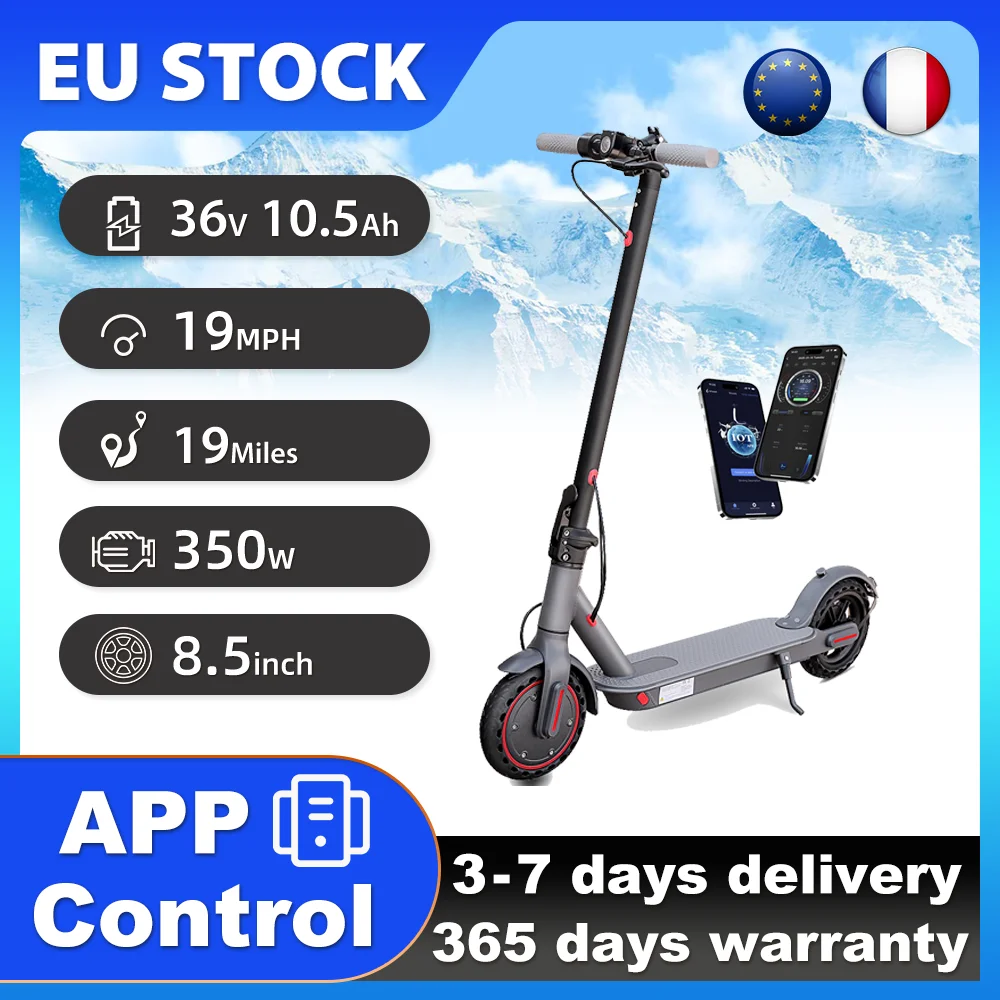 EU Warehouse 2026 New Electric Scooter 350W High-Torque Motor 36V 10.5Ah Large-Capacity Battery Max Range 30km Max Speed 19mph 8.5Inch Tires Foldable Lightweight Frame Smart APP Control Portable E-Scooter for Urban Commute Daily Travel Leisure Ride Stable