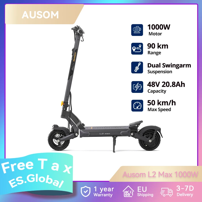 Ausom L2 Max UK Plug 48V 20.8Ah 1000W E-Scooter E-ABS + Dual Disc Brakes NFC LOCK 50km/h Max Speed 90km Max Range 30 N.m Torque