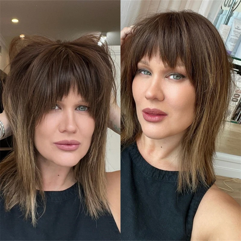 Straight Bob with Bangs Ombre Blonde Brown Highlights High Heat Fibre Synthetic Lace Front Wigs For Women Fashion Women's Wigs