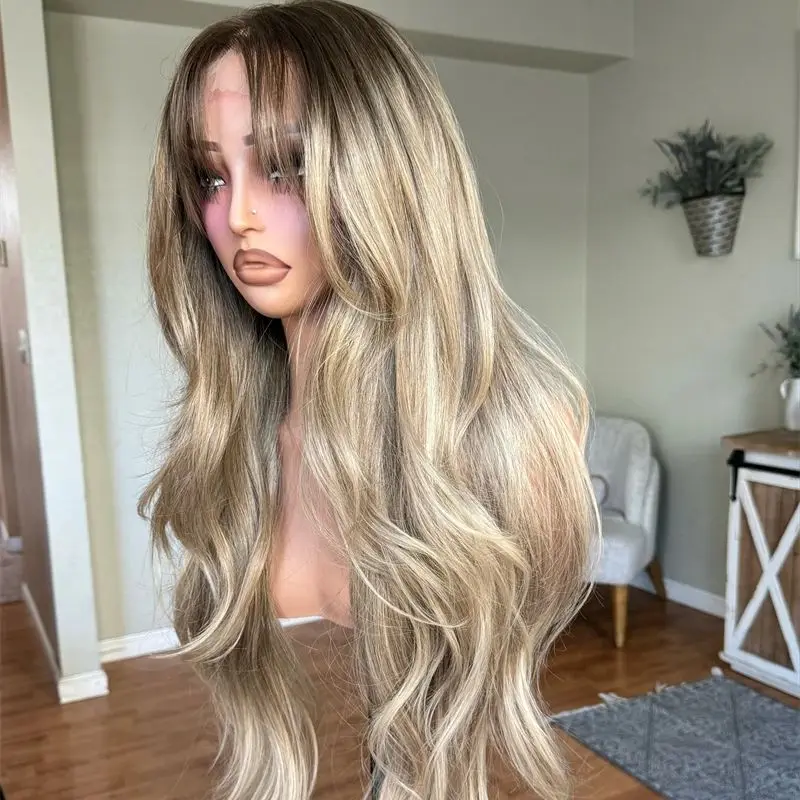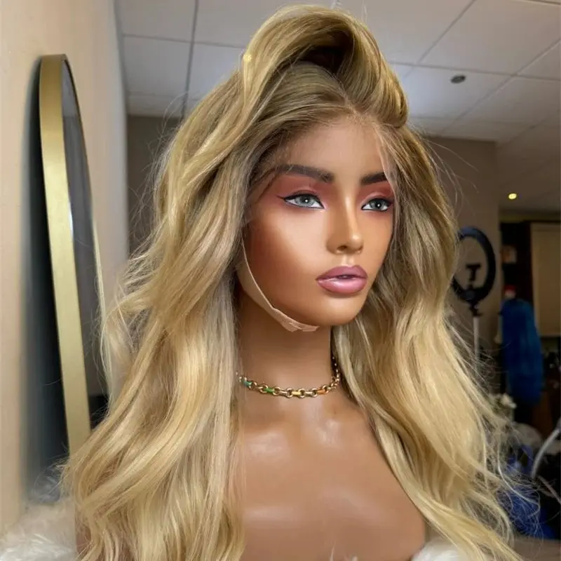 Glueless Wig 13x4 Ombre Blonde Brown Highlight High Heat Wig Realistic Baby Hair Wave Wig Human Hair Blend Pre Plucked Hairline
