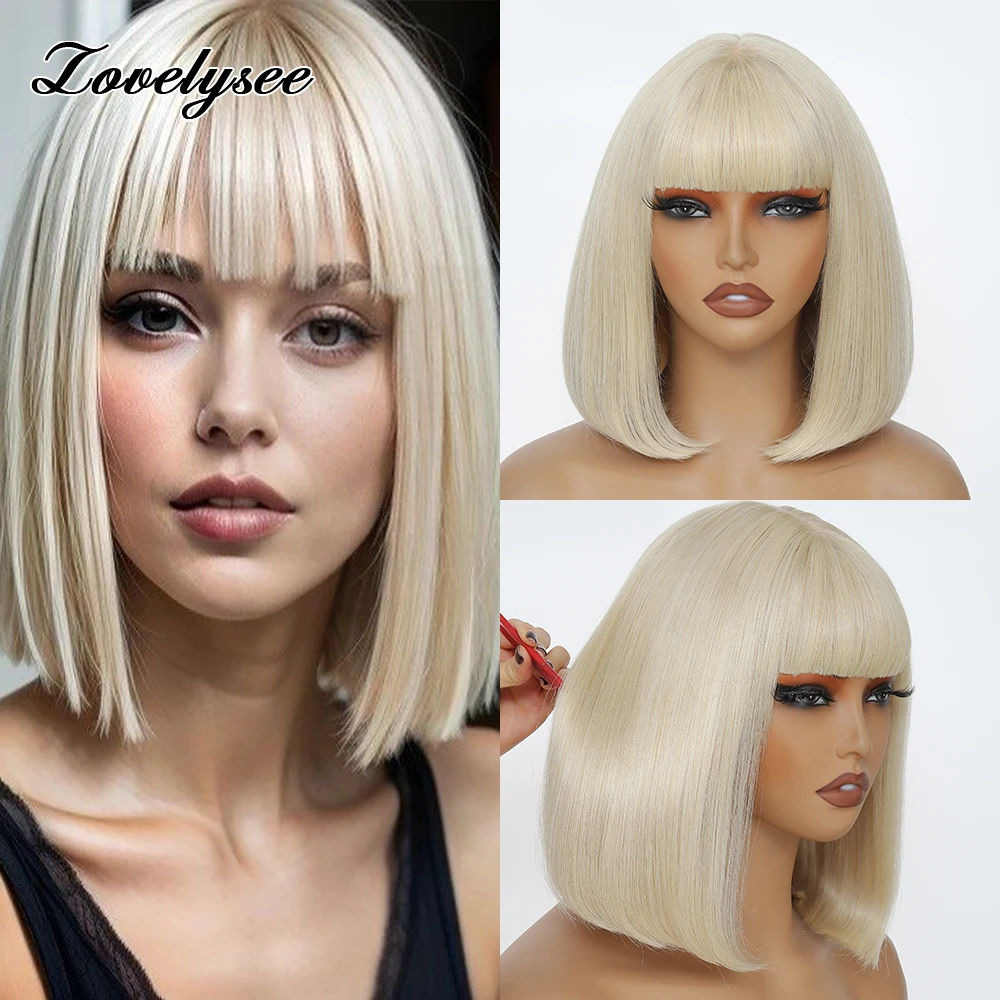 12" to 18"Short Bob Human Hair Wigs with Bangs 180% None Lace Front Wigs Brazilian Glueless Wear and Go Short Straight for Women