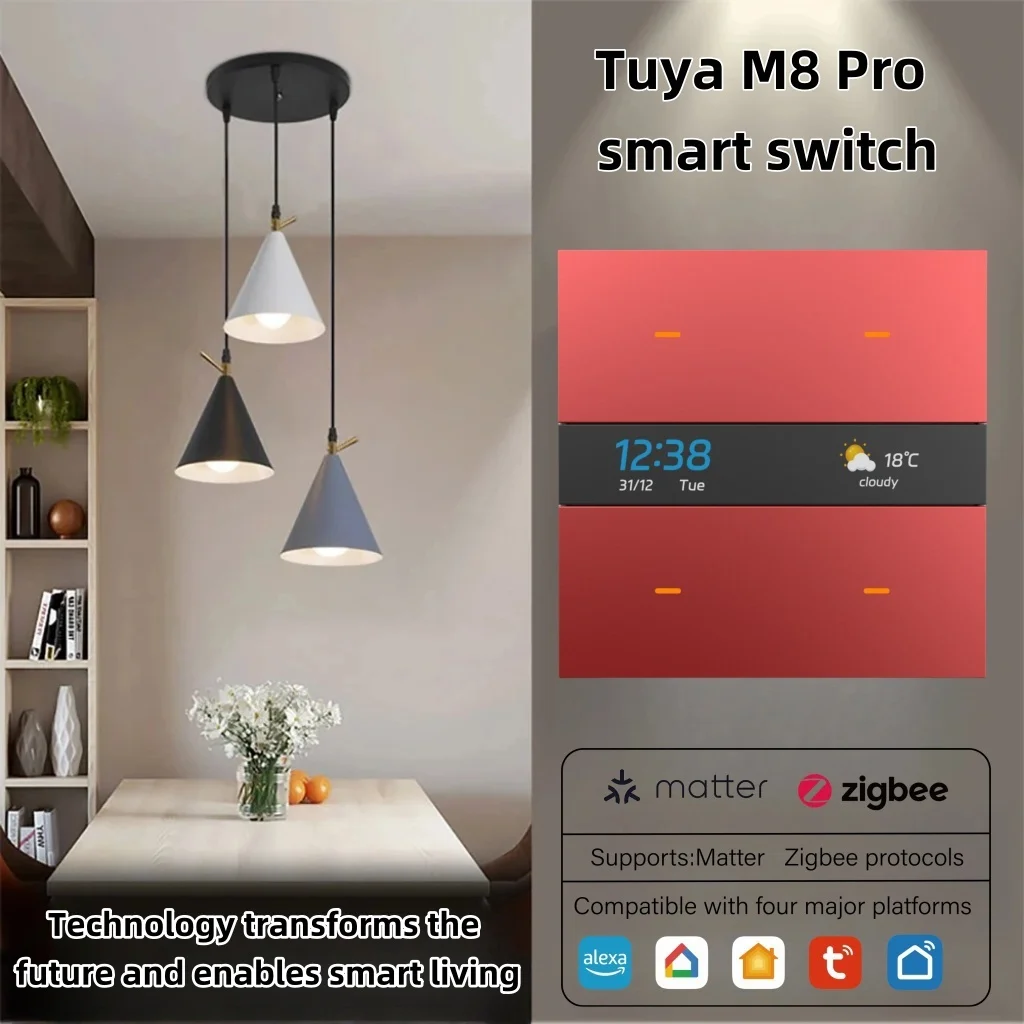 M8 Pro Tuya Zigbee smart wall switch, zero-live wire version, with Alexa and Google voice devices. Weather and time display.