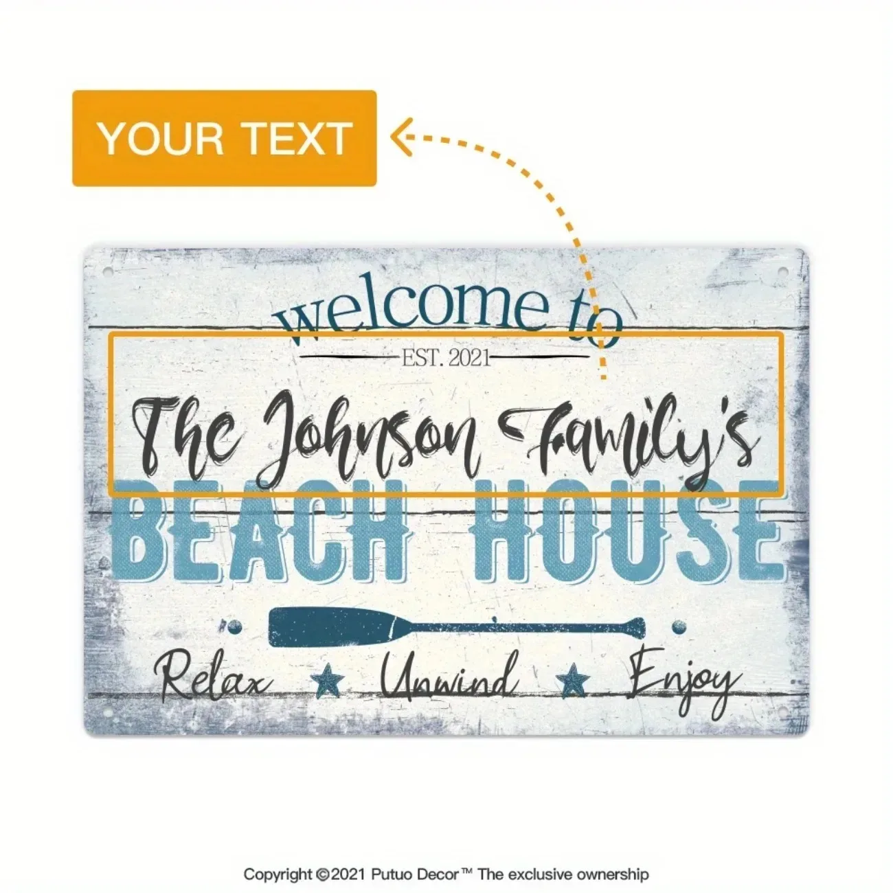 Custom Metal Tin Sign, Personalized Family Name Beach House Decor, Vintage Nautical Welcome Wall Art Gift (Decoration Only)
