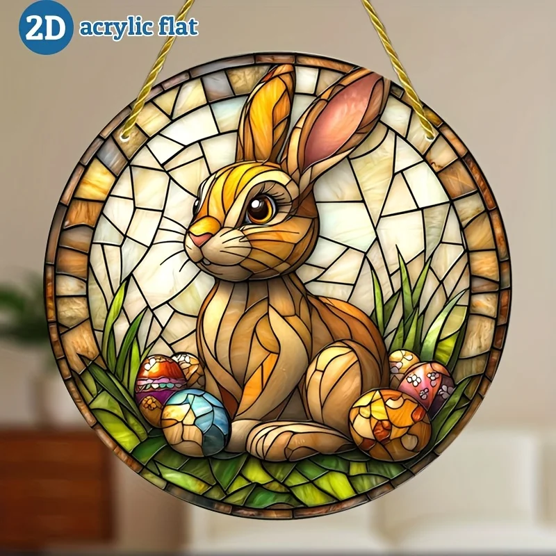 2D Flat - 1pc 2D Plane Circular Acrylic Hanging Decoration | Featuring Stained Glass Design of Easter Bunnies and Eggs, Ideal fo