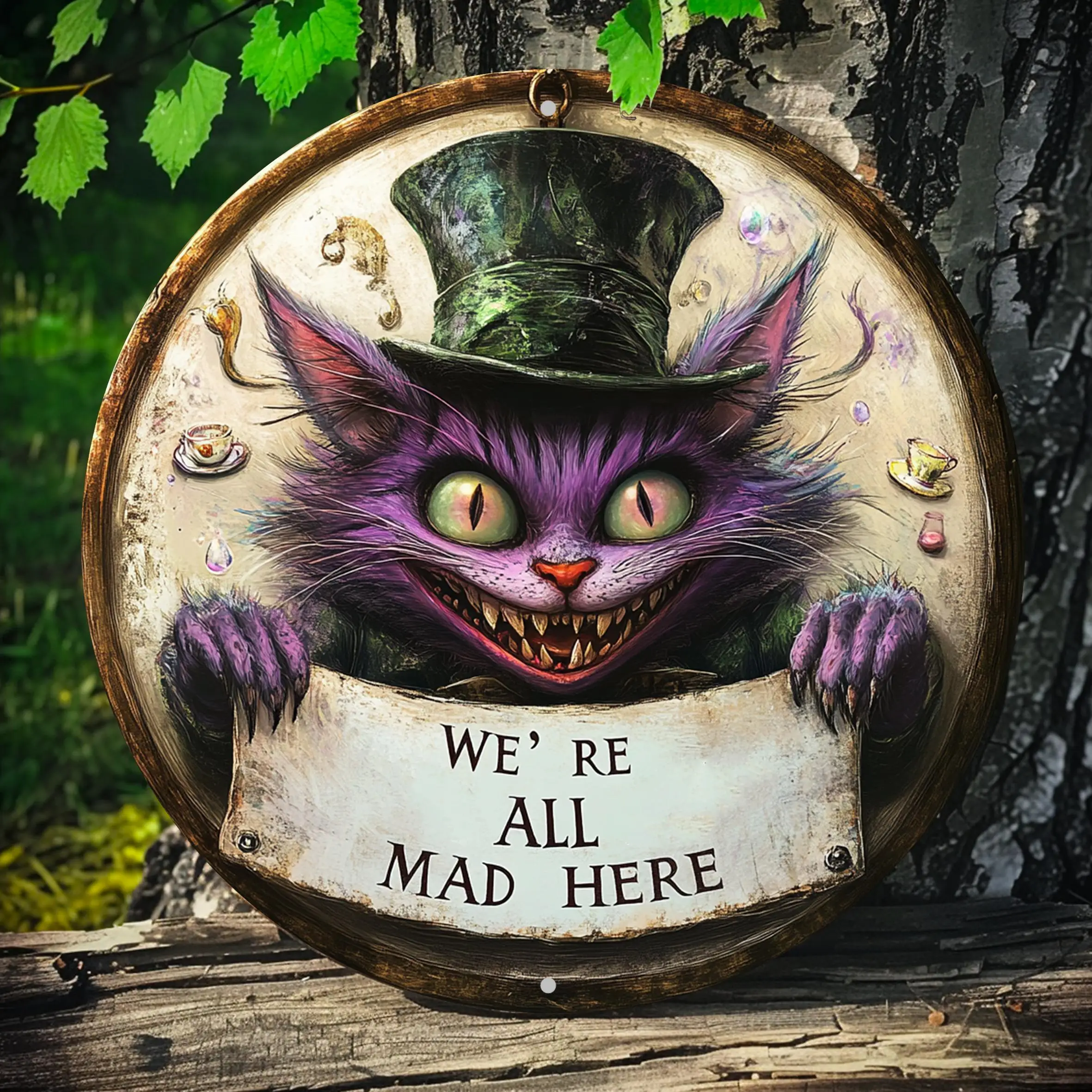 [2D Flat] 1pc Cheshire Cat Whimsical Metal Wall Art - Vintage Round Aluminum Sign with "We're All Mad Here" Design, Purple Creat