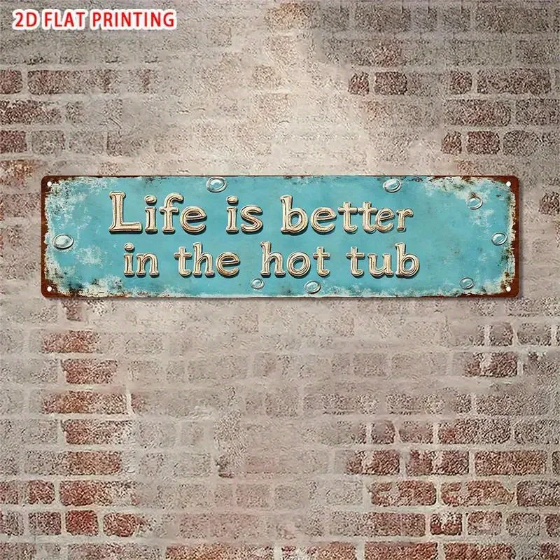 2D Flat, Vintage "Life Is Better in the Hot Tub" Metal Wall Sign - Rustic Teal Distressed Hot Tub Decor with Worn Edges, Indoor/