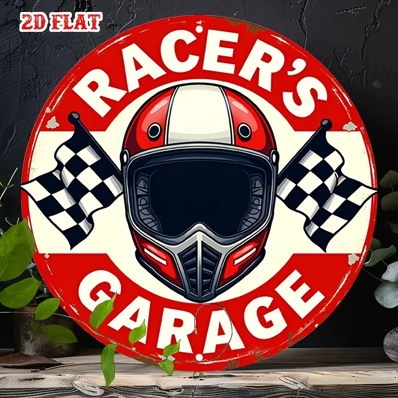 2D Flat 1pc Vintage Metal Sign Old-Fashioned Sign with A Racing Flag And Helmet, RACER's GARAGE Retro Fonts Retro Vintage Look W