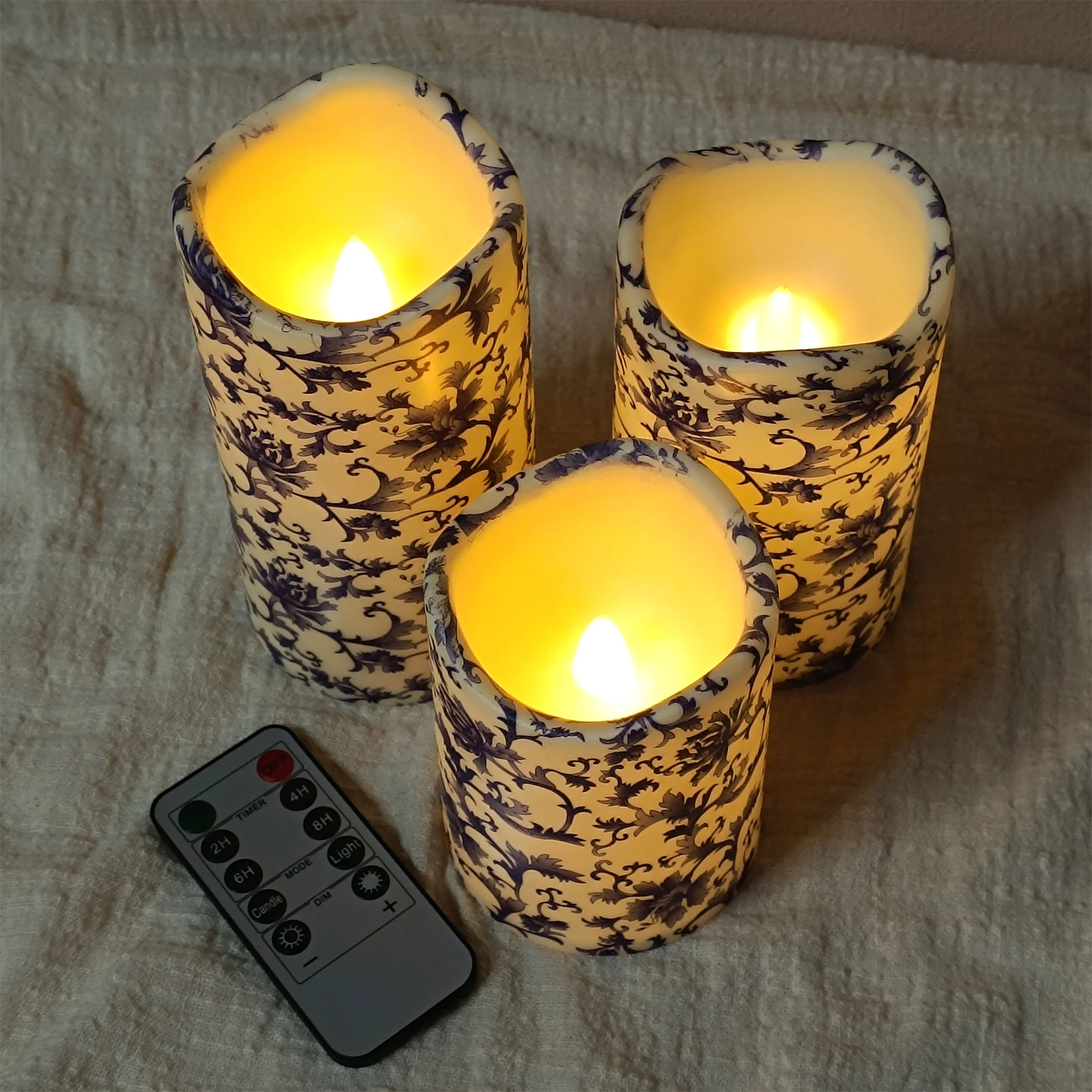 Printed Flameless Candles with String Lights - Set of 3 Battery Operated Candle Flickering Floral LED Pillar Candles with Timer