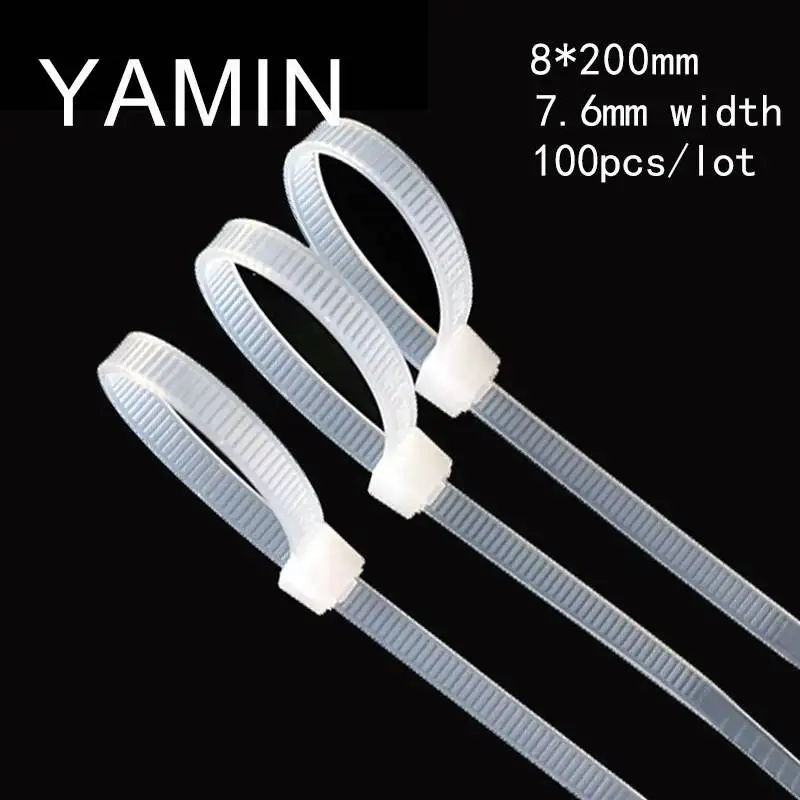 100pcs 8*200mm Industrial Plastic Nylon Cable Tie 7.6mm Width Multi-Purpose Fastening Fix Locking Type