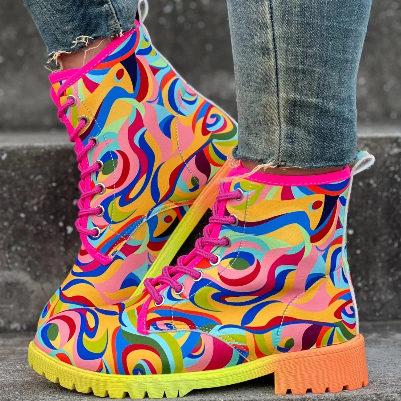 Women's Plus Size Graffiti Ankle Boots Fall/Winter Lace-Up Printed Ankle Boots Winter Round-Toe Chunky-Heel Ankle Boots
