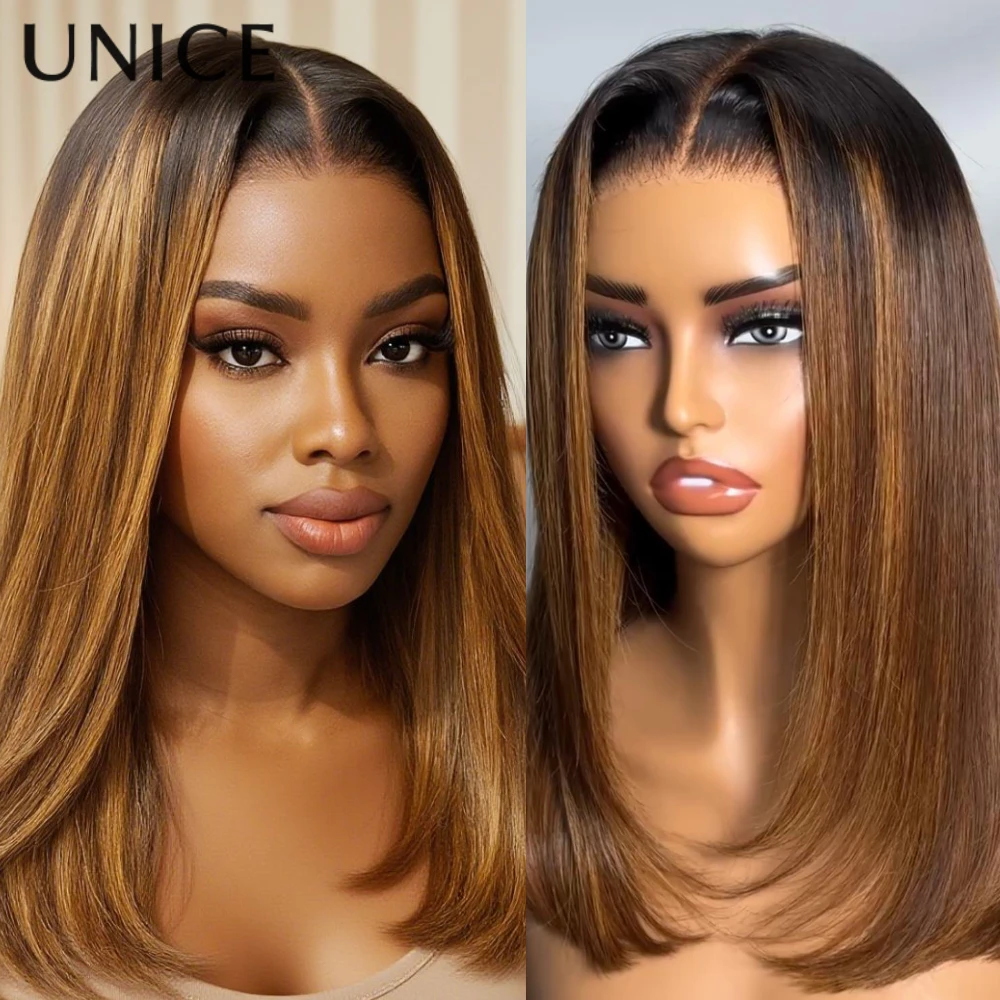 UNice Brown With Blonde Piano Highlights Blunt Bob Wig With Dark Roots No-Slip 7x5 Pre Cut Pre Bleached Glueless Human Hair Wigs