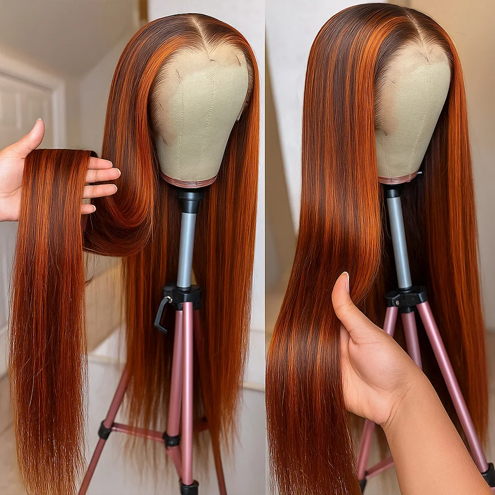 32inch 5X5 Brown Ginger Straight Lace Front Closure Wigs Human Hair Pre-Cut Lace with Baby Hair 180% Density Highlight Color Wig