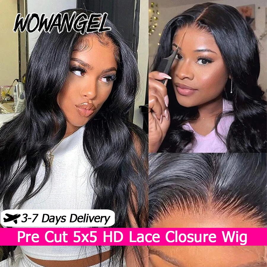 WOWANGEL Body Wave Wigs Pre Cut 5x5 HD Lace Closure Wigs 100% Human Hair Wigs Ready To Wear Pre Plucked Glueless Wigs For Women