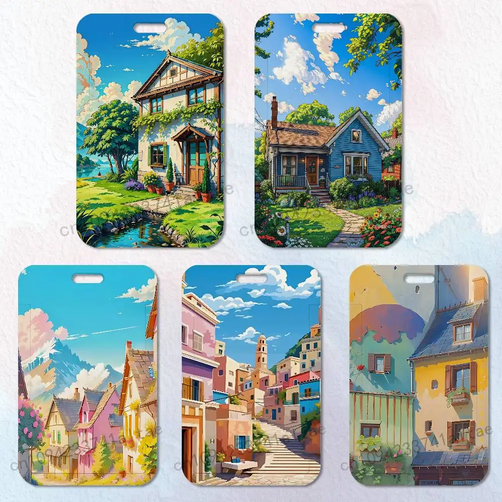 Scenery Painted Art House Badge Holder Pass Bus Work Card Cover Chest Pocket Students Gift ID Card Holder