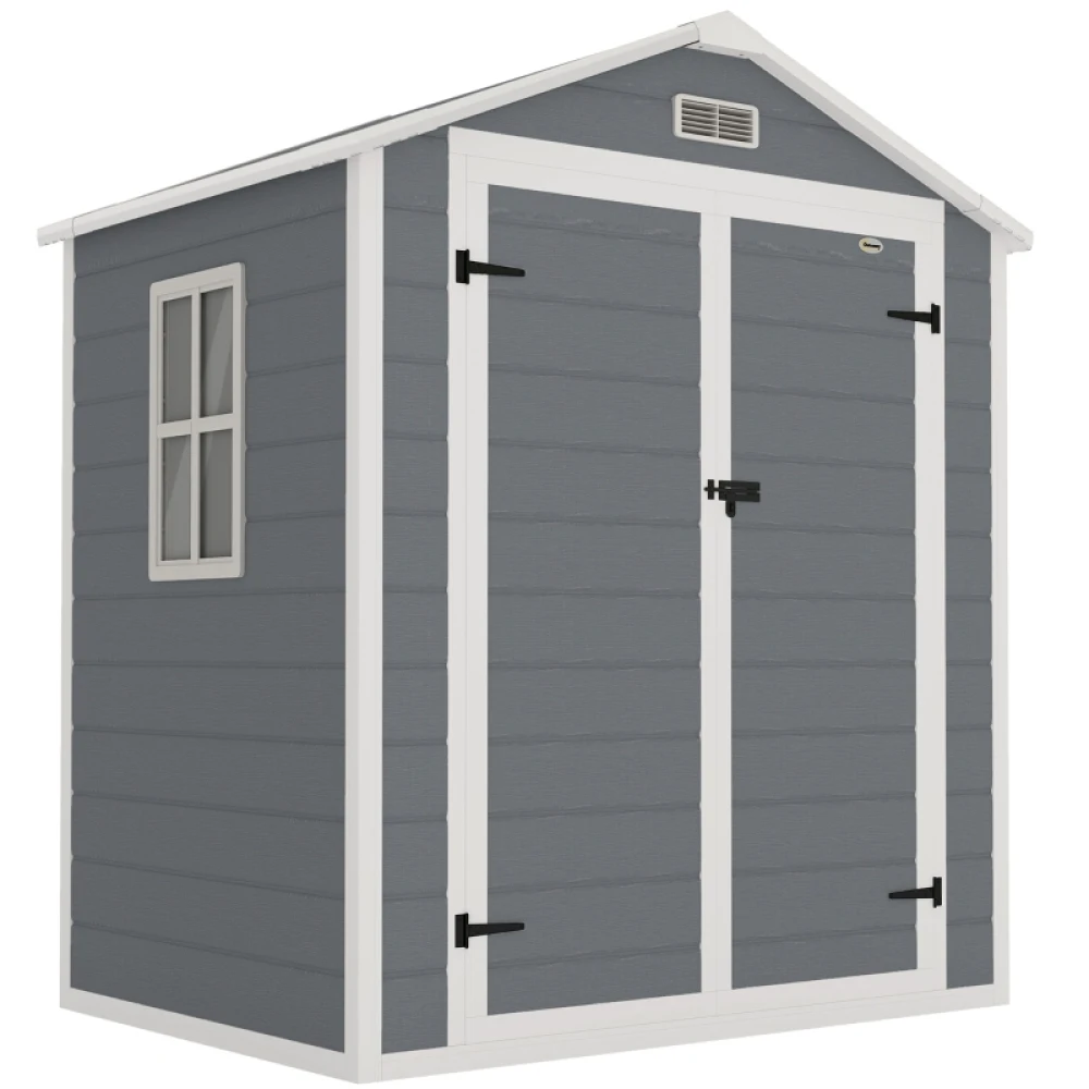 PINGGO 6'x4.5' Garden Storage Shed, Lockable Garden Shed with Double Doors, Window, Vent and Plastic Roof, Grey