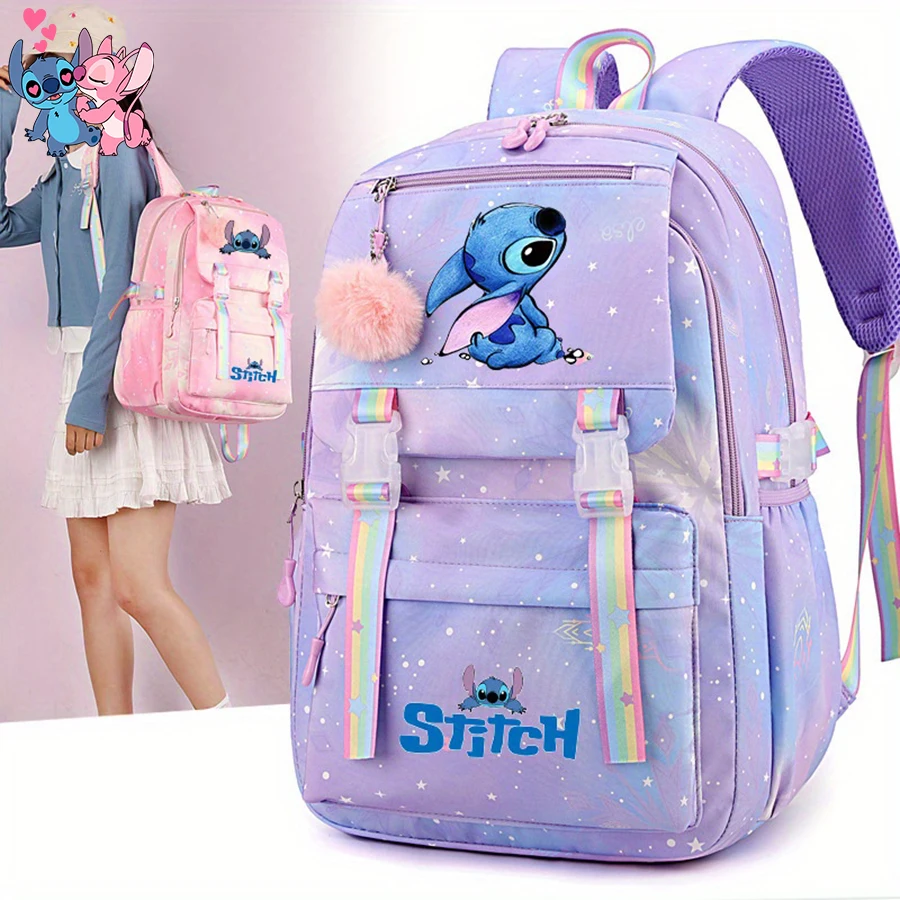 Bohemian-Style Stitch Cartoon Pattern Rainbow Nylon Backpack, Gradient Color Design, Lightweight & Large-Capacity Travel Backpac