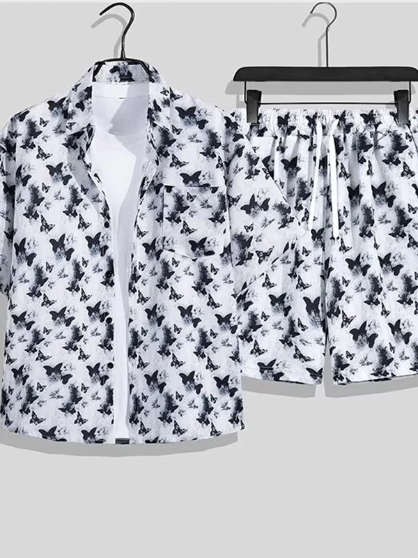 Summer Thin Fashionable Men's Print Ice Silk Shirt Short Sleeve Set Youth Polyester Fiber Short Pants Ensemble
