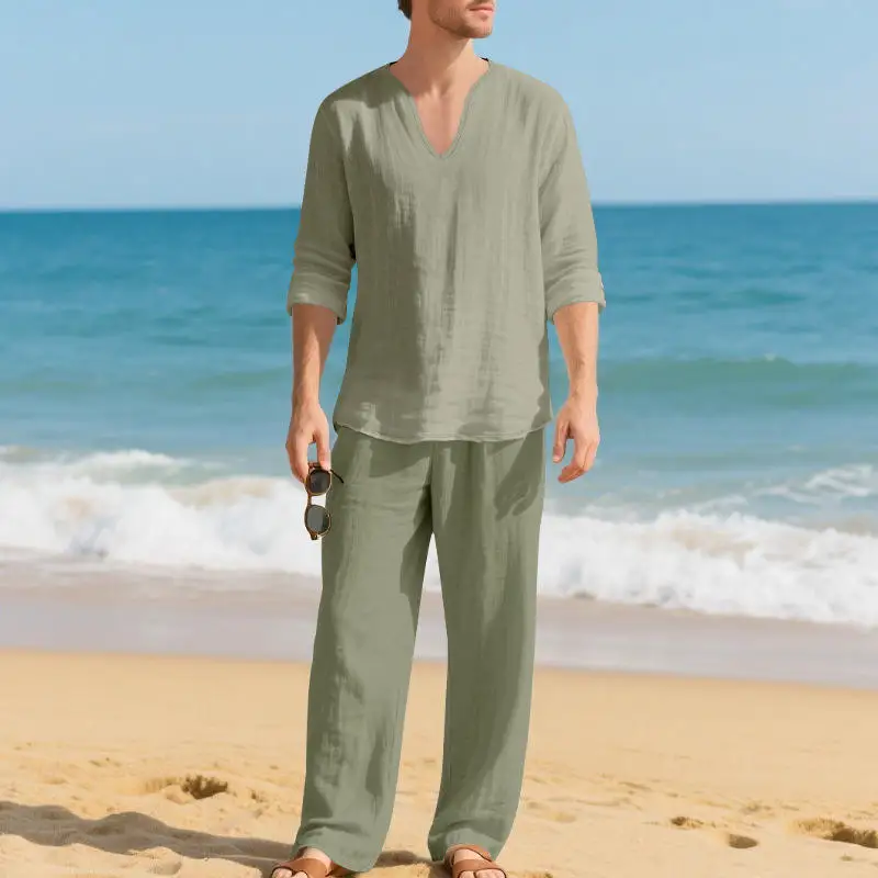Loose Linen American Casual Men's Beach V-Neck Design Long Sleeve Long Pants Set Autumn Season Men's Fashion T-Shirt
