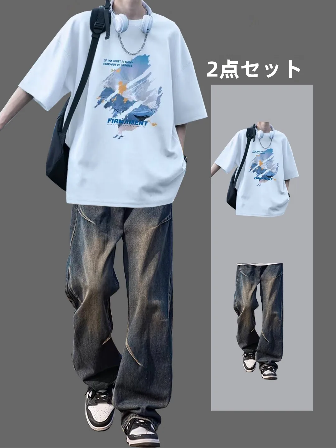 Summer New Loose Men's ort Sve T-irt Printed Jeans Youth Set Faion Brand Casual Comfortable Breathable Cotton Suit