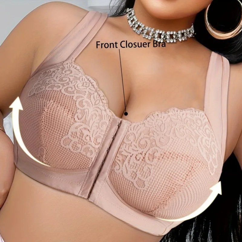 7-Row Front Closure Bra Non Padded Wireless Lace Embroidered Full Coverage Minimizer Bra - Sexy Plus Size Support Bra 85C-110F