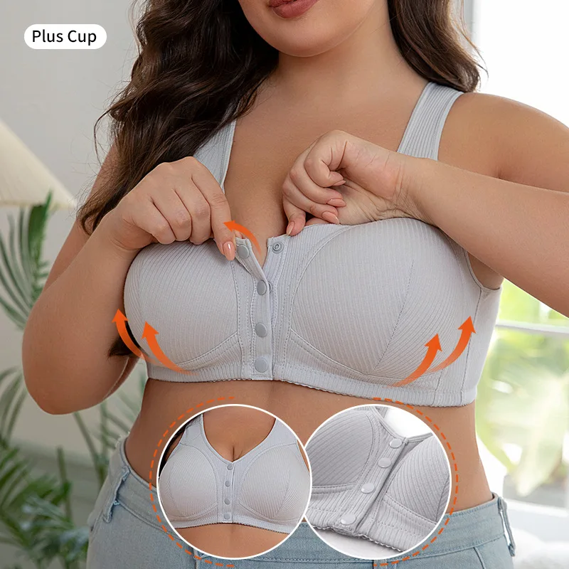 Front Closure Cotton Bralette for Women, Wireless Plus Size Ribbed Bra with Full Coverage Comfort for Middle Aged