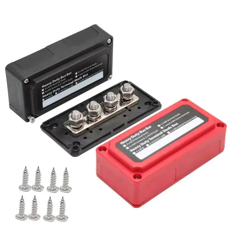 Bus Bar Power Distribution Block 12-48V Red Copper Nickel Nylon M6 M8 M10 For Truck Boat Marine Single Row 4 Studs Heavy Duty