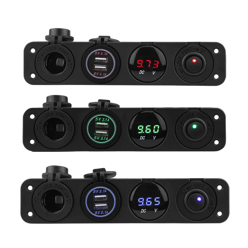 12-24V RV Motorhome LED Dual USB Charger Voltmeter Cigar Lighter Power Outlet 4 Hole Panel Switch For Camper RVs Accessories