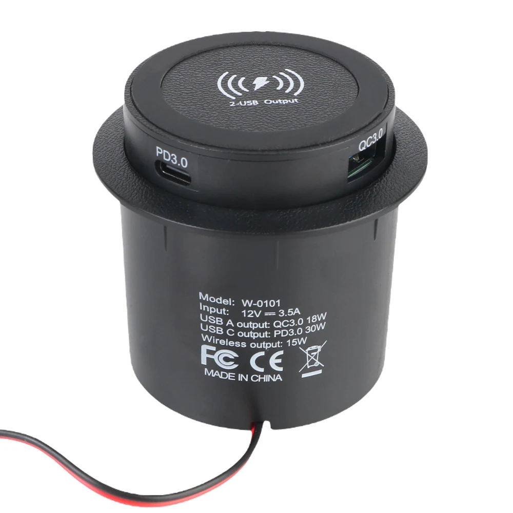 For Car RV Truck Trailer Outlet Socket Quick Charger PD 3.0 USB Type-C For Camper Truck ATV Boat Embedded Wireless Charger 15W