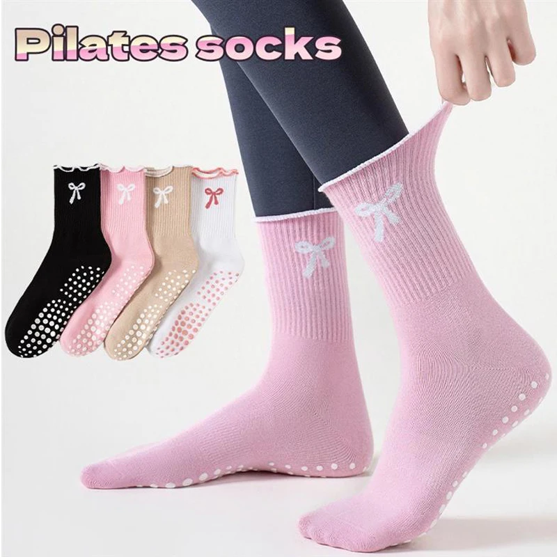 Dreamlikelin 1 Pair Women's Mid-Calf Pilates Socks Non-Slip Professional Yoga Socks Bow Print Fitness & Sports Socks