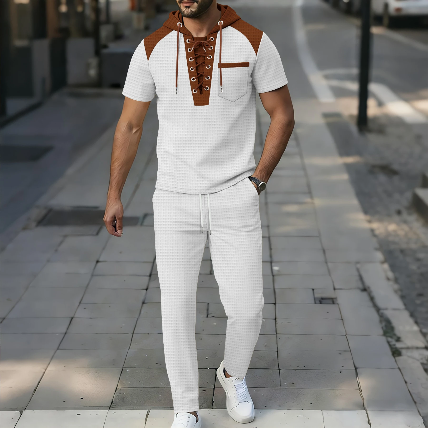 Men's 2 Piece Textured Outfits, Beige Hooded Shirt & Drawstring Pants Set