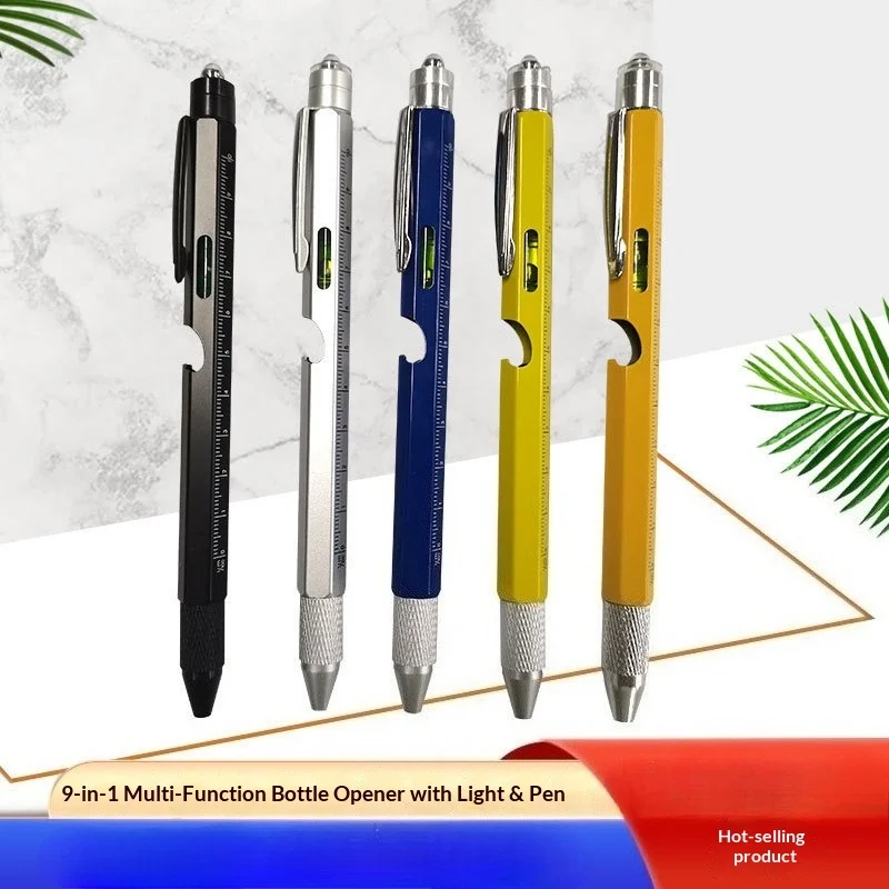 European and American 9-in-1 multifunctional LED tool brush screen ballpoint pen with bottle opener bracket metal pen