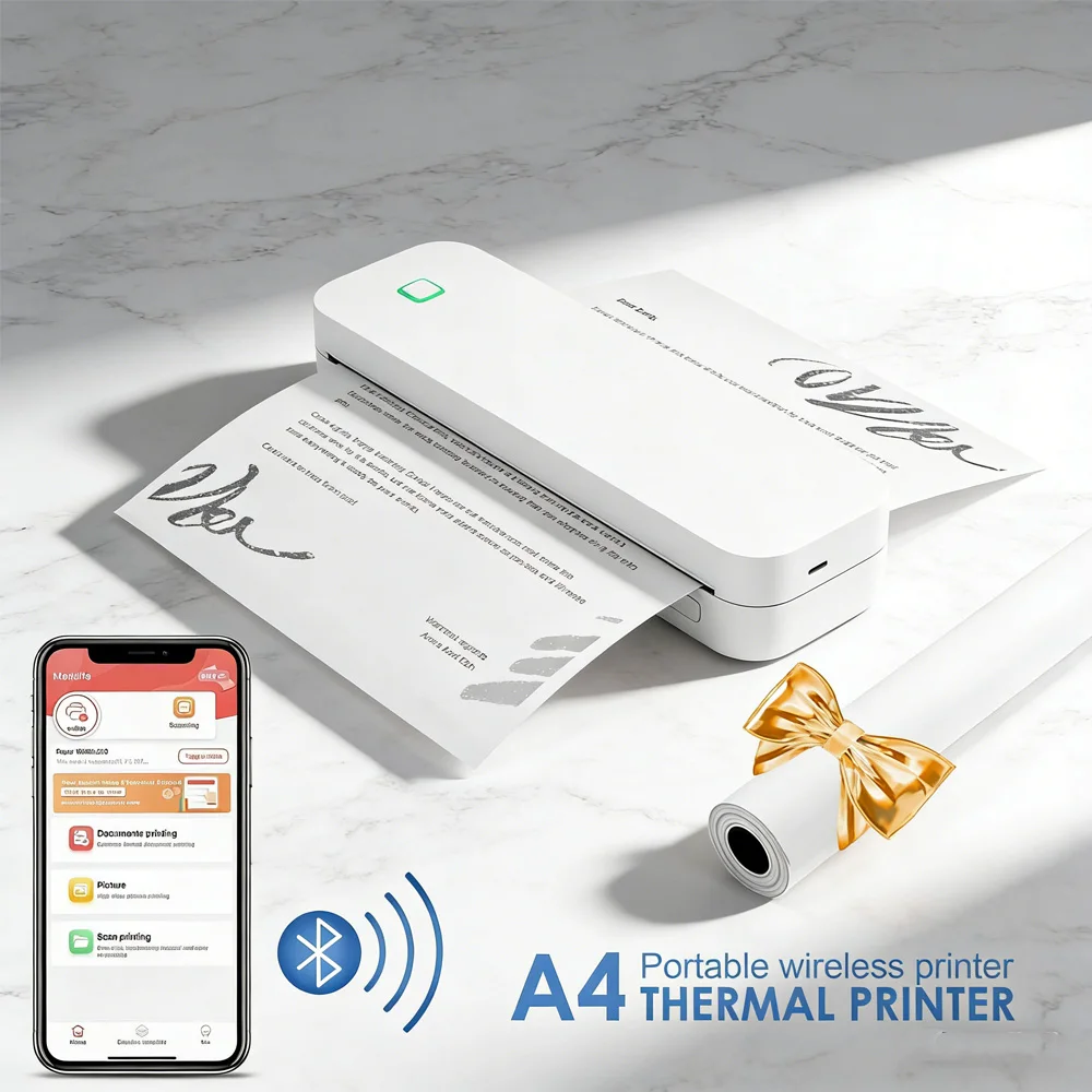 Portable Bluetooth Thermal Printer: Inkless Travel, 3”/4”/8” Roll Paper, Fits A4 Docs/Contracts/Receipts