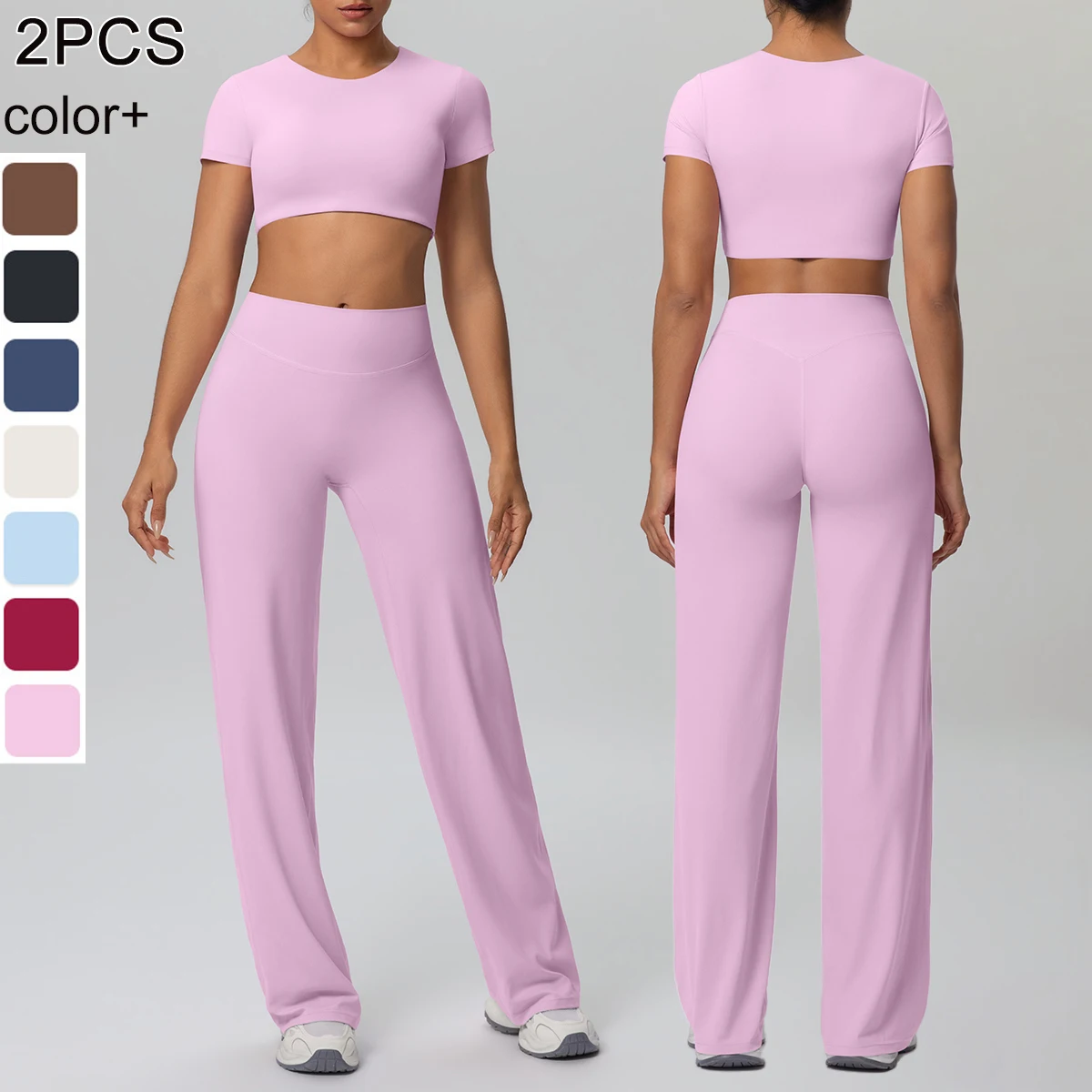 2Piece Women Yoga Set Slim Running Shirts Short Sleeve Gym Workout Top Loose Solid Color High Waisted Outdoor Running Yoga Pants