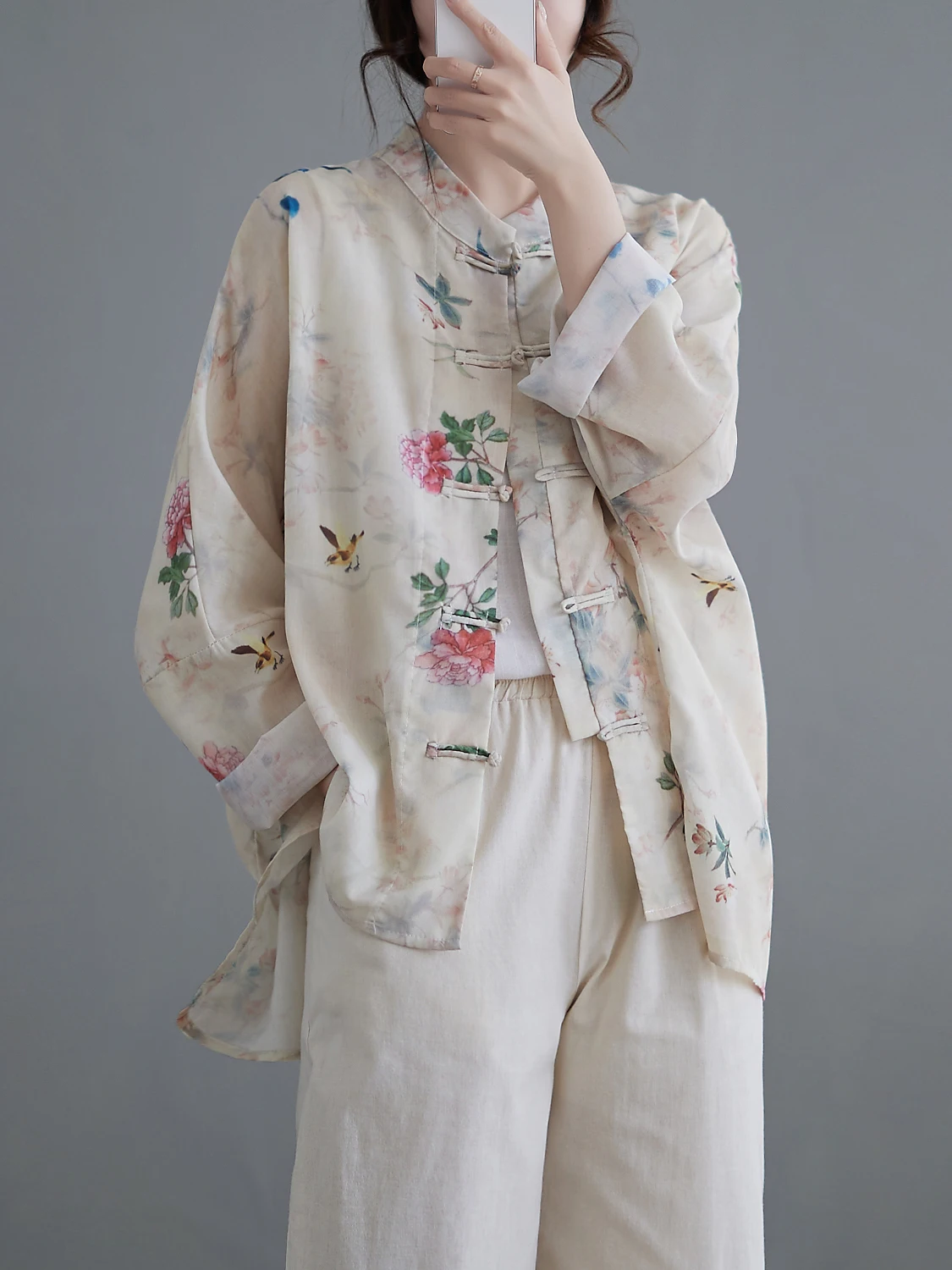 New Chinese Sle Loose Cotton Linen irt Women's Summer Faion Sun Protection Top Large Size Open Cardigan Printed Button