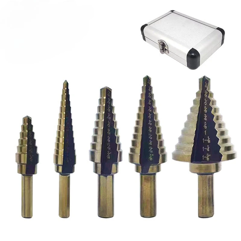 5PCS Imperial Black-Yellow Step Drill Bit, Triangular Shank Straight-Groove Hole Drilling & Reaming Tool 5-Piece Step Drill Set