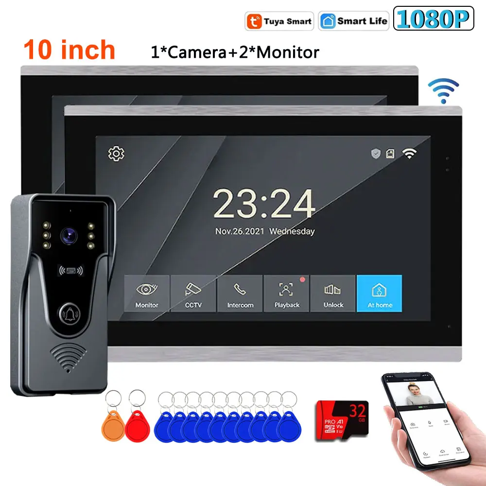 1V1/1V2 10 Inch Touch Screen Wireless WiFi Video Doorbell 4 wires HD 1080P Tuya Smart Home Doorphone Intercom RFID Access System