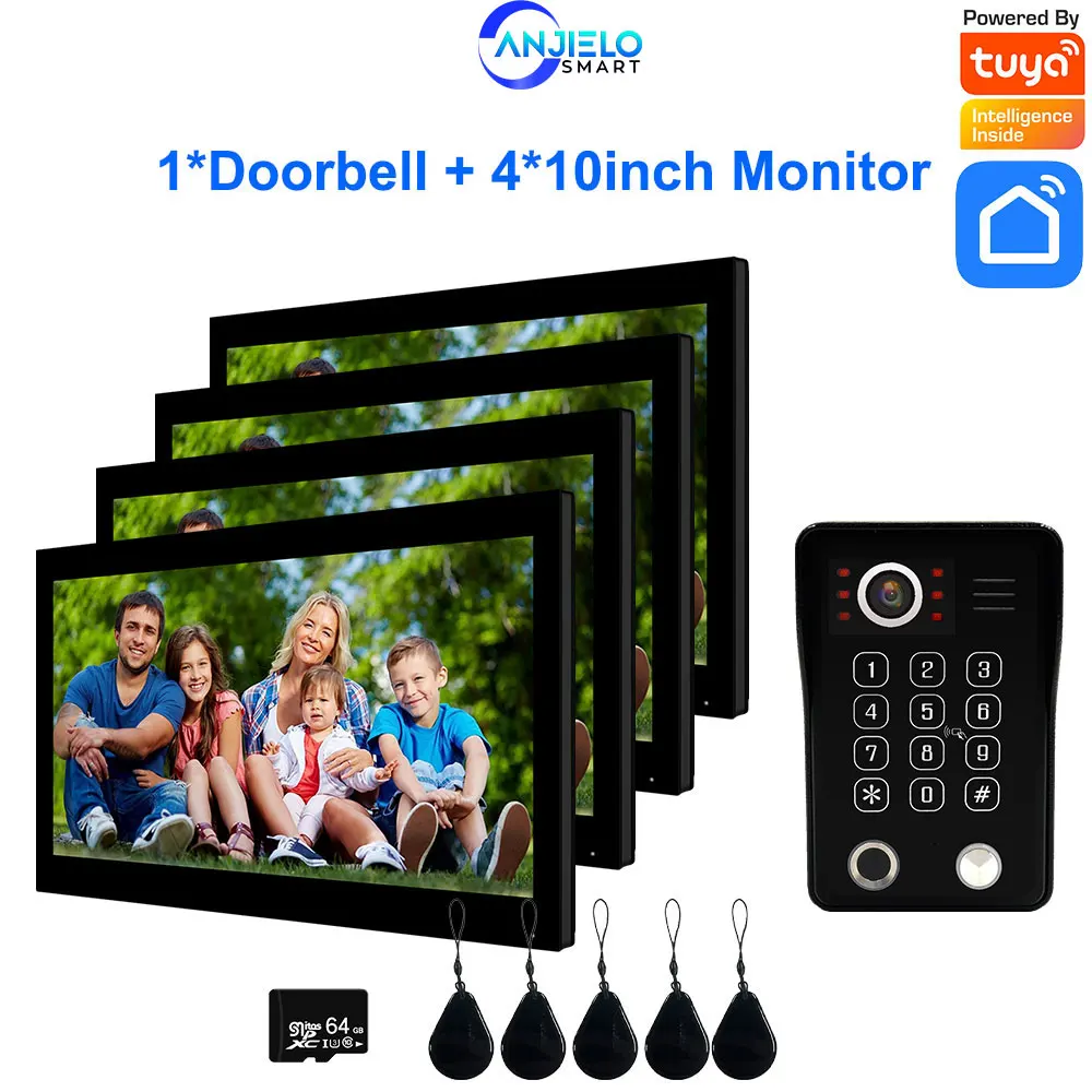 Anjielo Fingerprint 5in1 Unlock Doorbell Video Intercom for Home 10inch Touch Screen 1080P Tuya Smart Video Doorphone 4 Monitor
