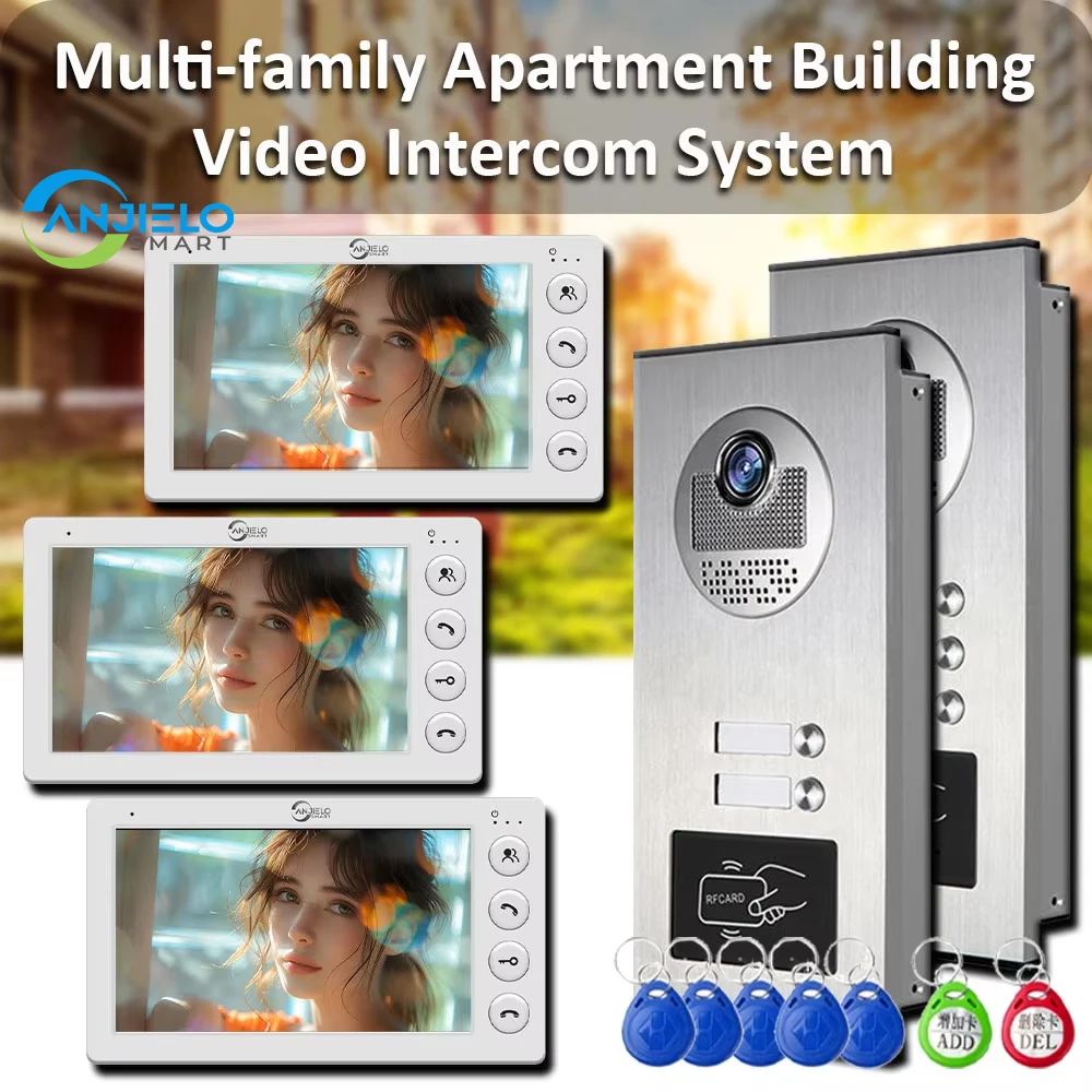 ANJIELO 2-3 Unit Multi Apartments Intercom System Video Doorbell with RFID Card Unlock 7inch 4-Corded Video Door Phone Interfone
