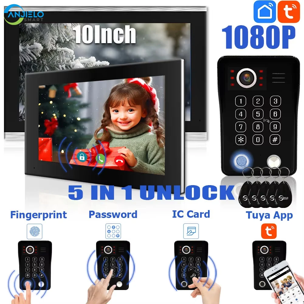ANJIELO1080P Tuya Wifi Intercom Fingerprint 5 in 1 Unlock Doorbell Video Intercom for Home Touch Screen Video Doorphone Security
