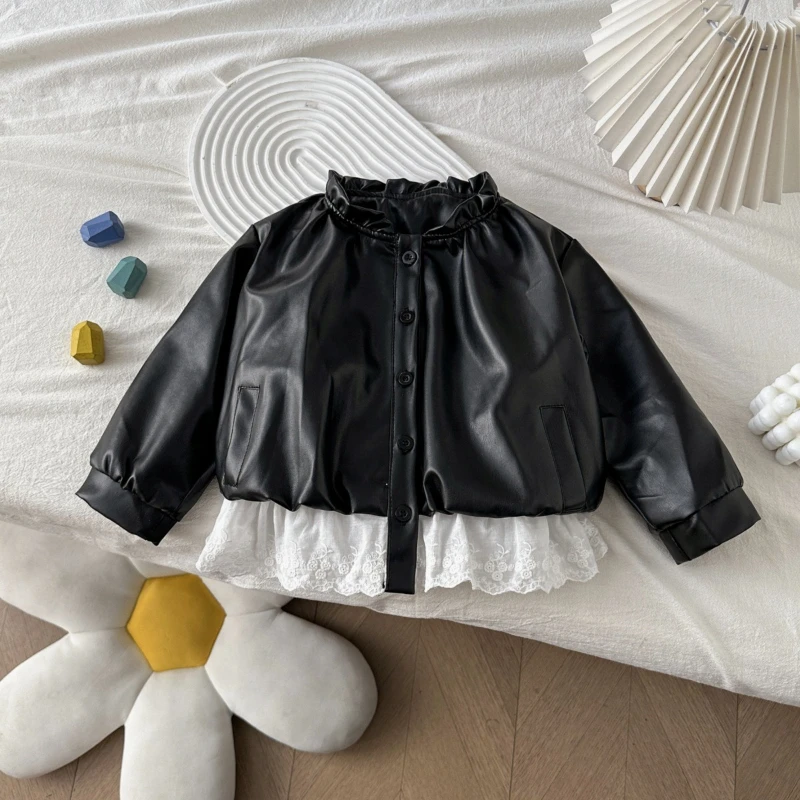 Girls' Leather Jacket, Spring New Collection, Girls' Forest Style Lace and Lace Patchwork Leather Jacket