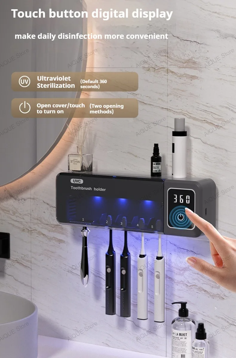 AiQUE 99.99% UV Toothbrush Sterilizer Rechargeable Fan Fast Drying Wall-mounted Toothbrush Razor Holder With LED For Bathroom