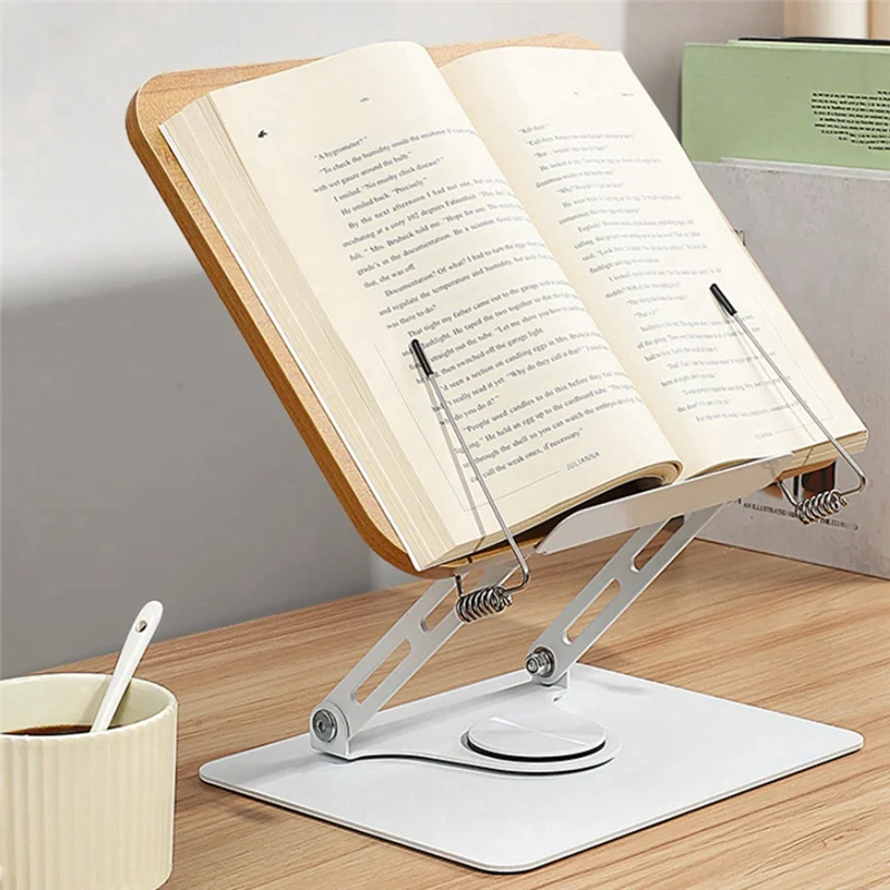 A68P-360°Rotating Base Book Stand Holder For Reading Hands Free Foldable Book Display Stand With Paper Clips Wood Panel Stand