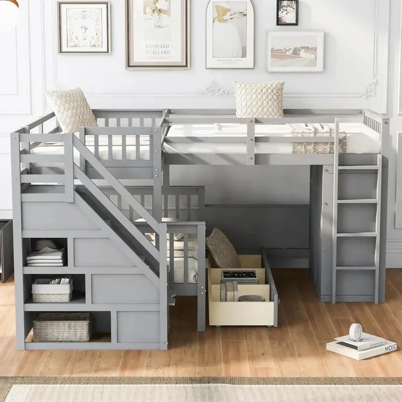 L-Shape Triple Bunk Bed with Stairs and Desk, Wooden Twin-Over-Full Design, Includes Storage Wardrobe, Shelves, and Drawers,