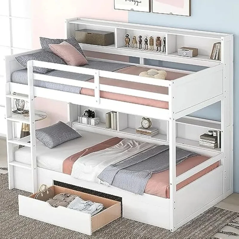 Twin over Twin Bunk Bed with Storage Drawer, Solid Wood Construction, Built-in Shelves on Each Side