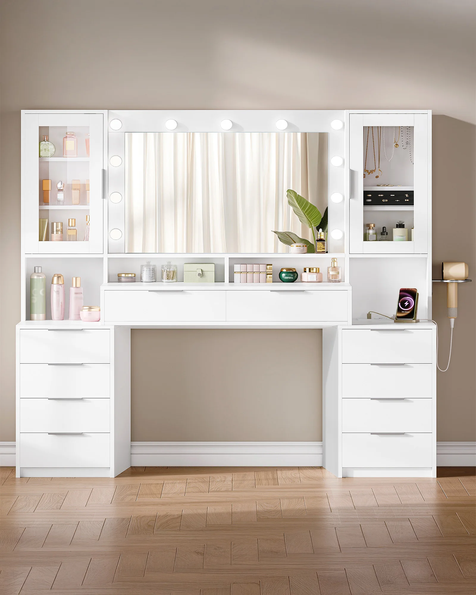 150cm Dressing Table with LED Lighting, Power Strip, 11 LED Bulbs, Three-Color Light Adjustment, 10 Drawers, Jewelry Storage