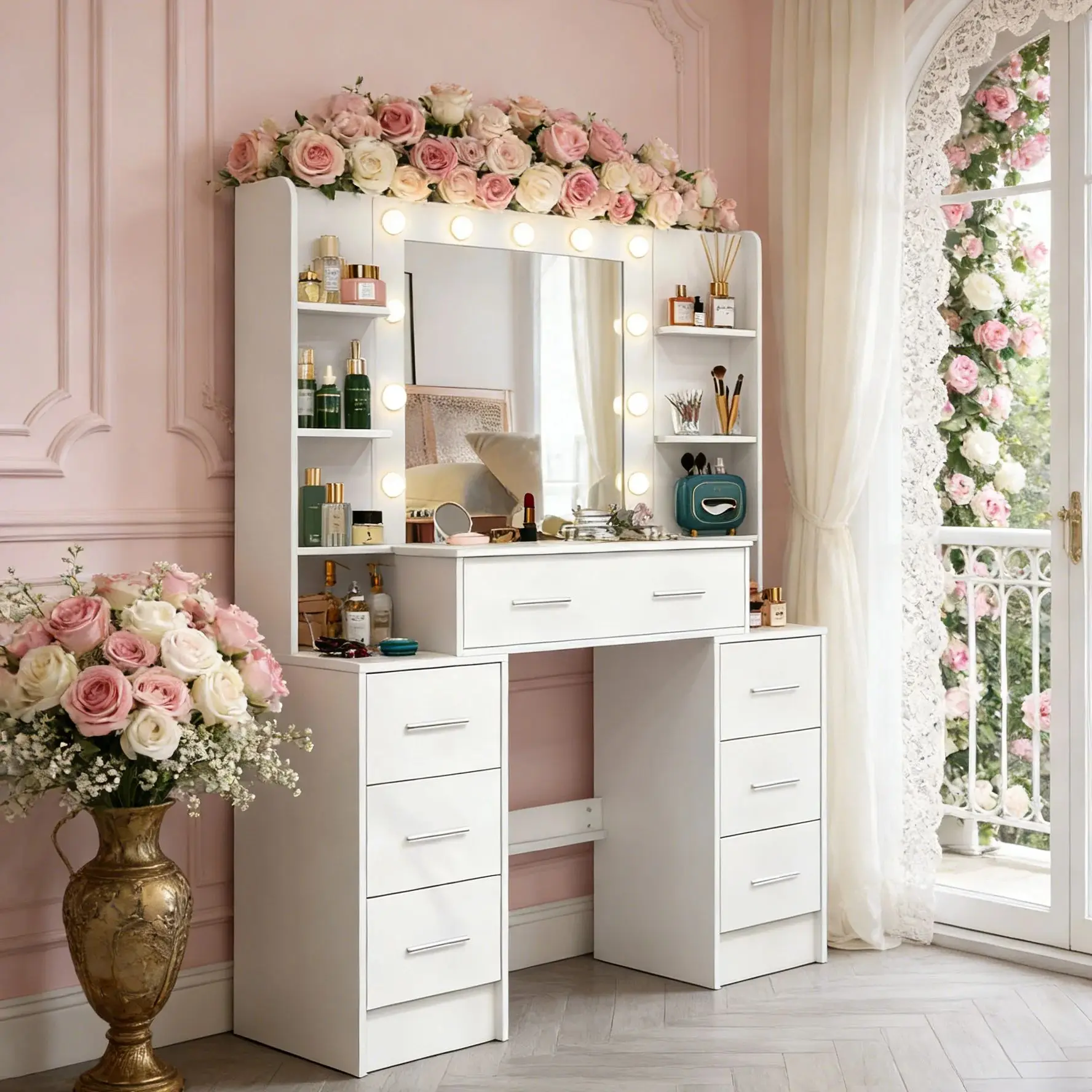 Teousev White Vanity Set, Hollywood Dimmable LED Bulbs Mirror, 7 Drawers Storage Organizer, Bedroom Makeup Dressing Table